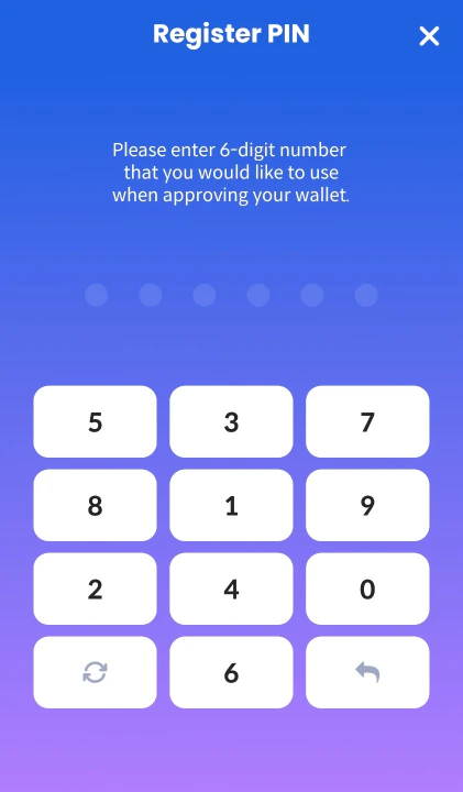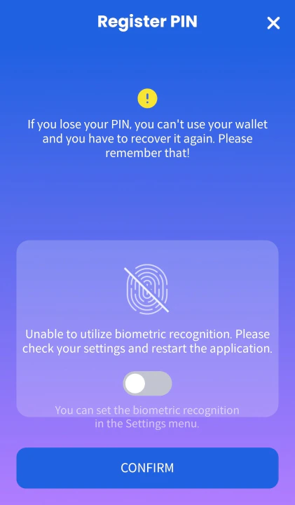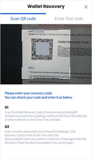 After PIN registration and biometric selection, scan the wallet recovery code at the top of the recovery document.