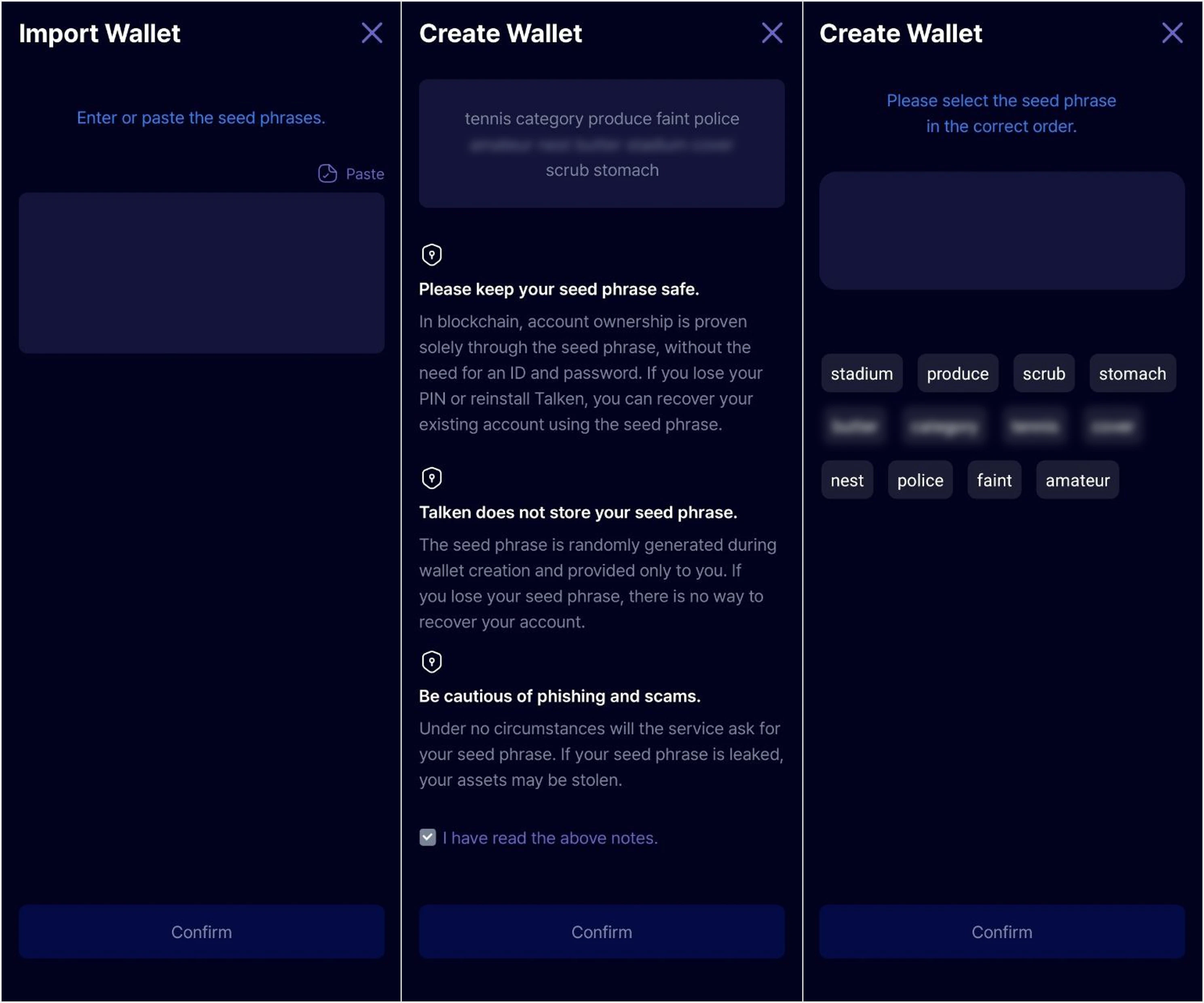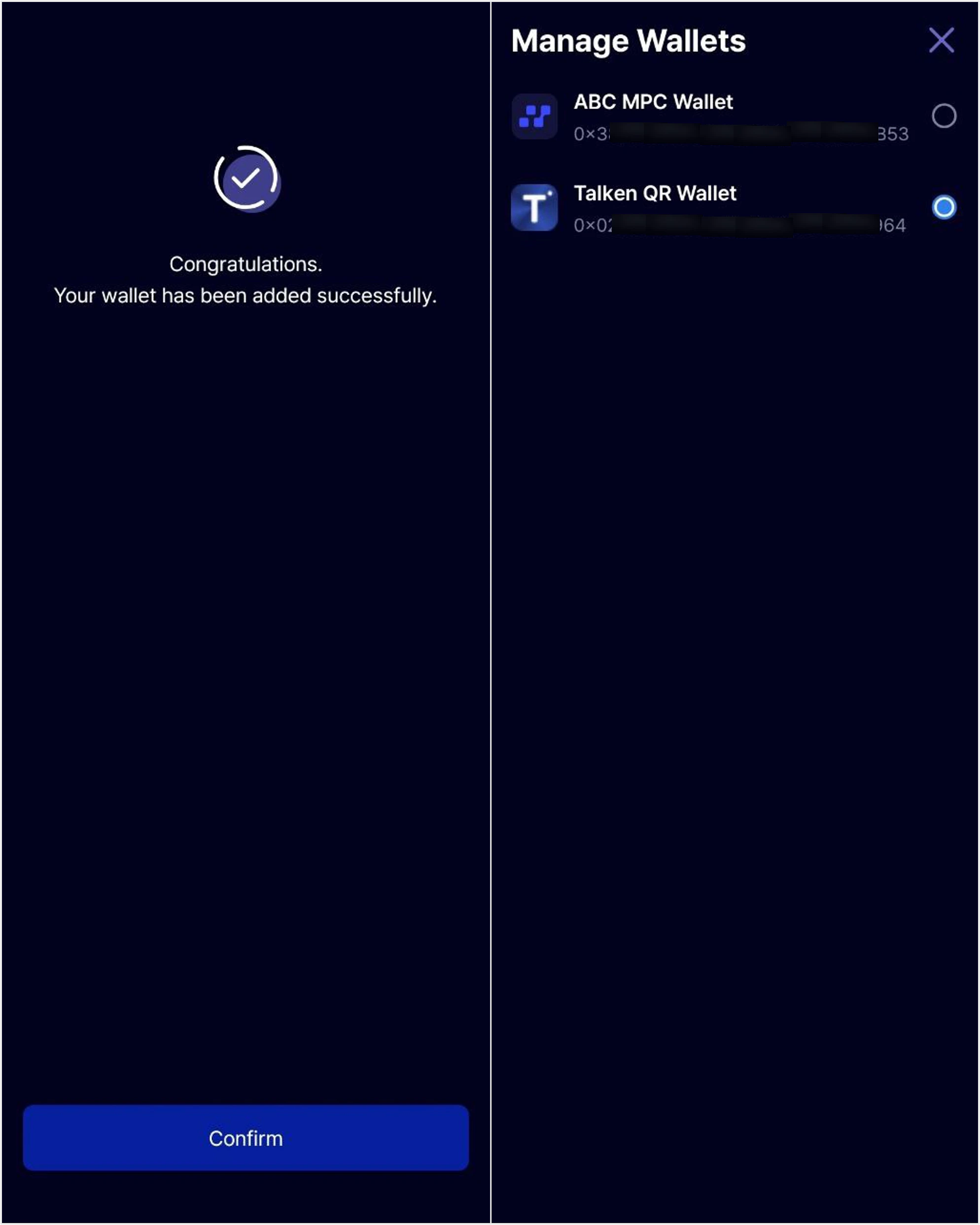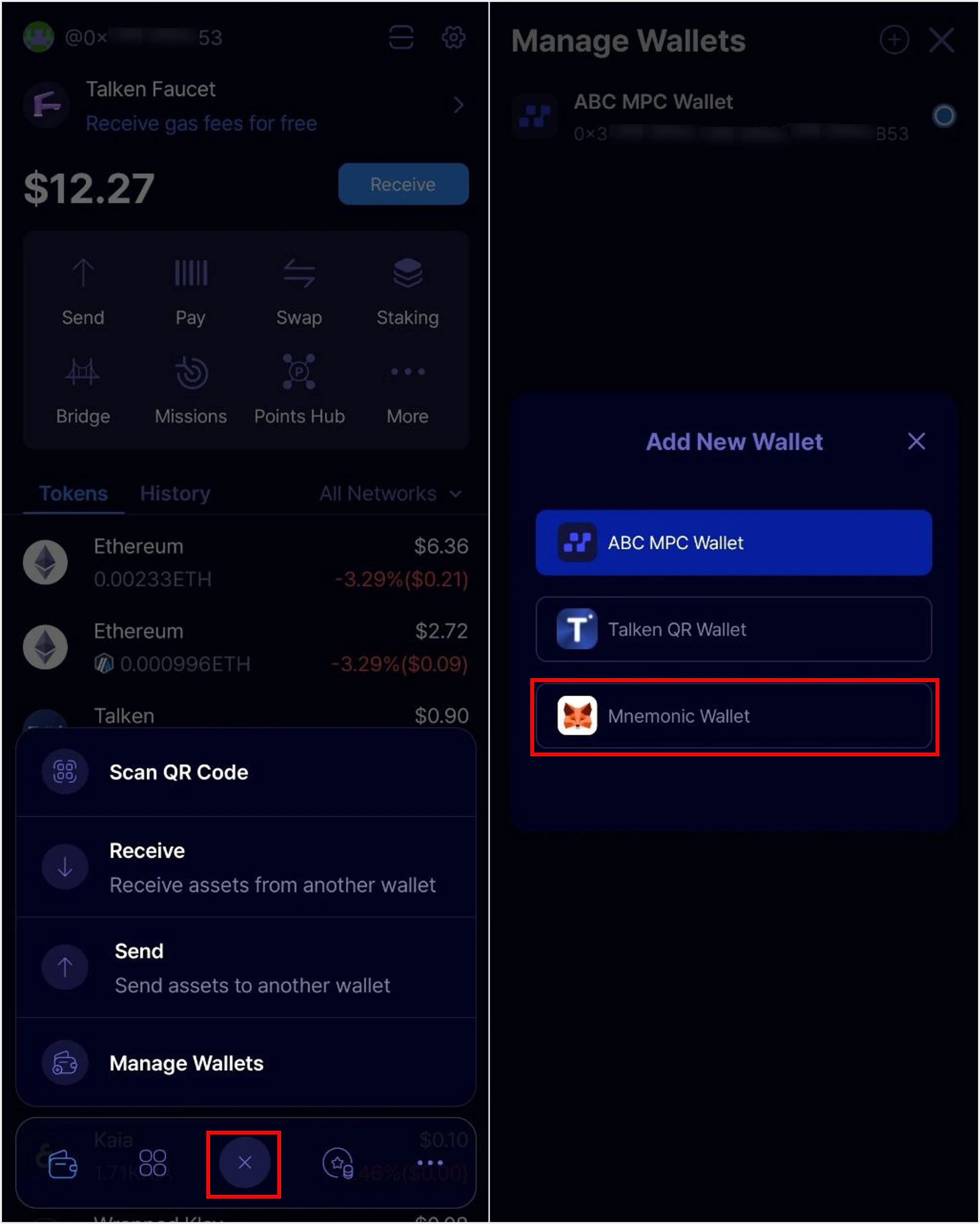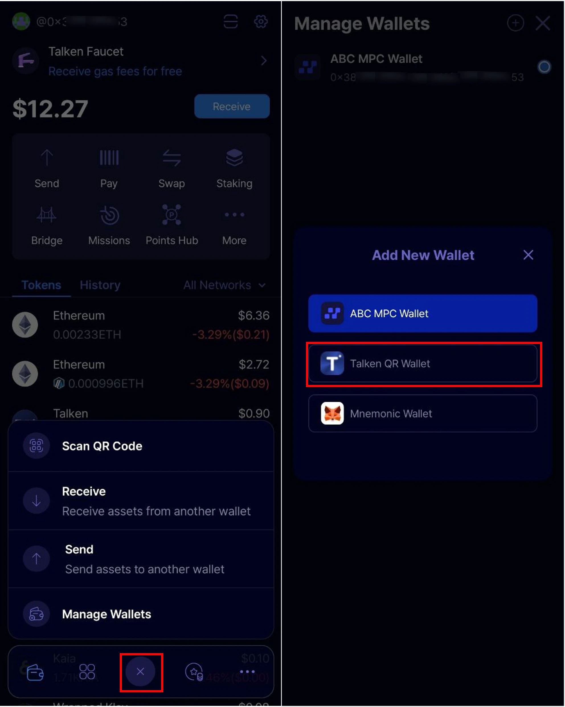 Tap the ’+’ button at the bottom center of the app main page, then select ‘Talken QR Wallet’.