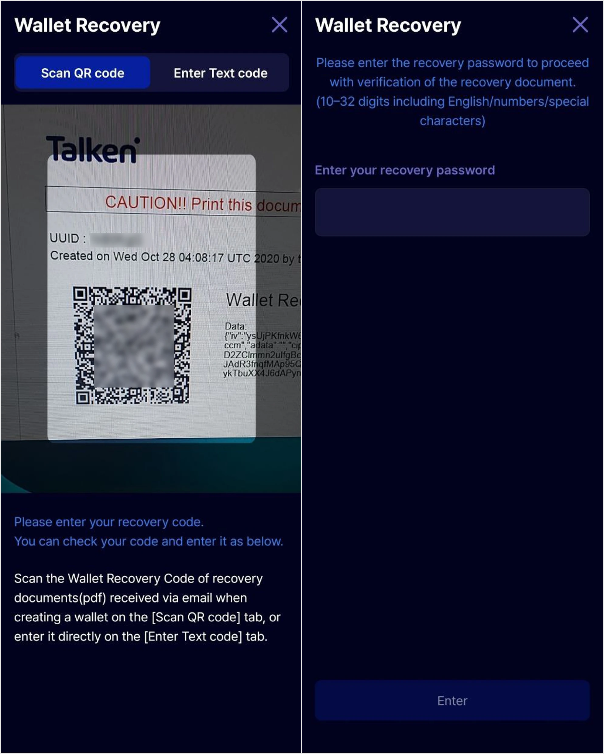 Scan the wallet recovery QR code on your recovery document, then enter your recovery password. Once you enter the correct password, your wallet recovery will be complete.