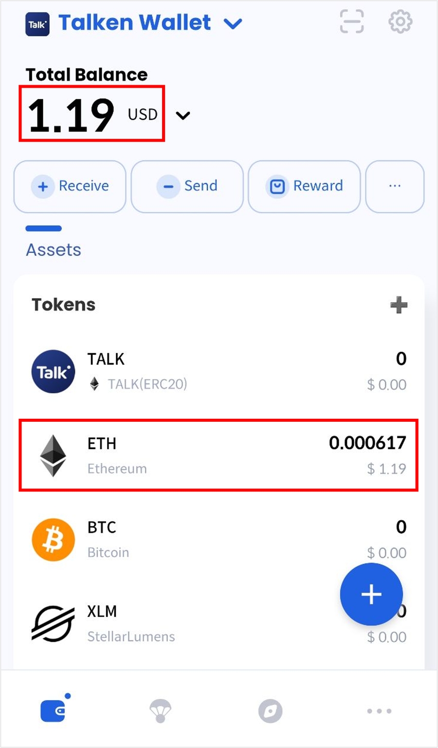 Now that the registration is complete, you can see the balance of Ethereum in your Talken's Ethereum wallet, which was previously in your metamask.