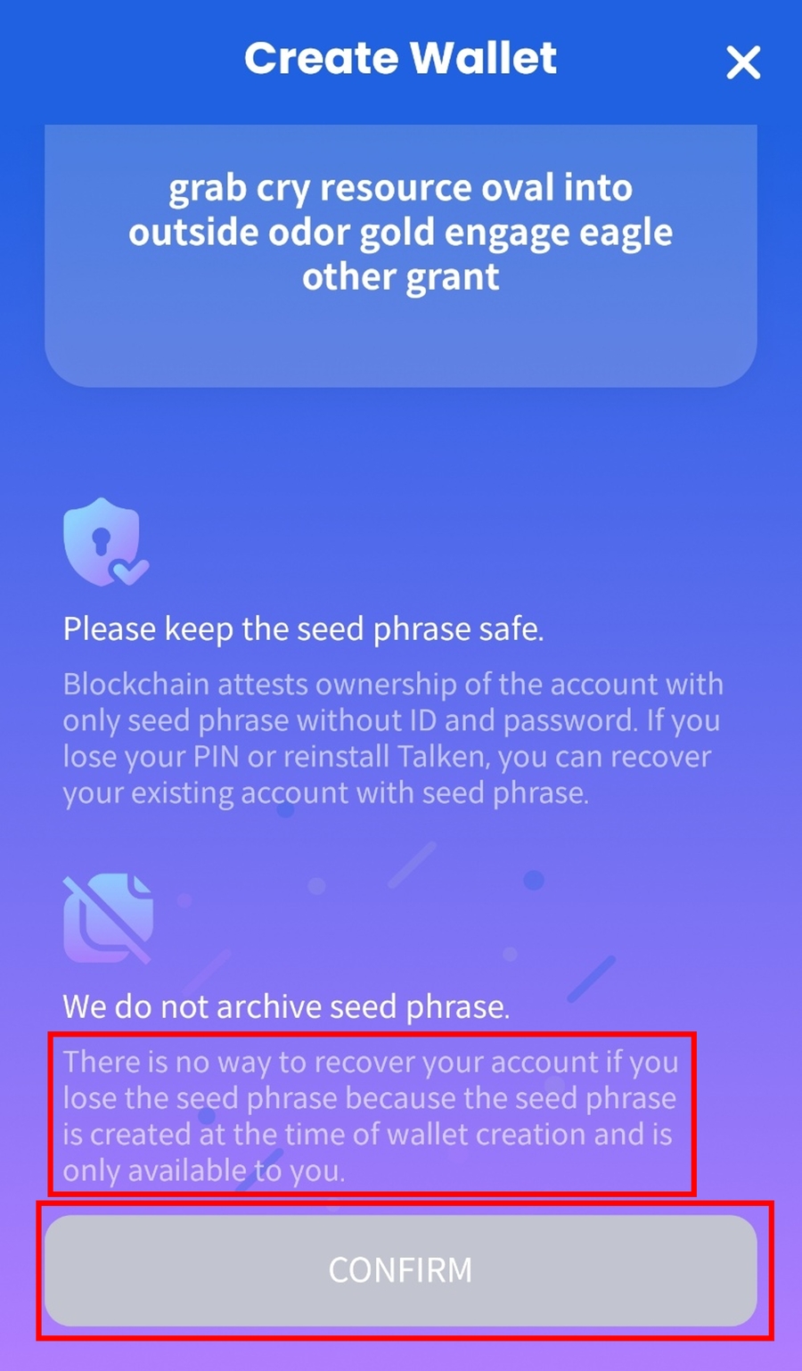 After taking note, please check the warning situation regarding wallet creation accurately, and then press the confirmation button.